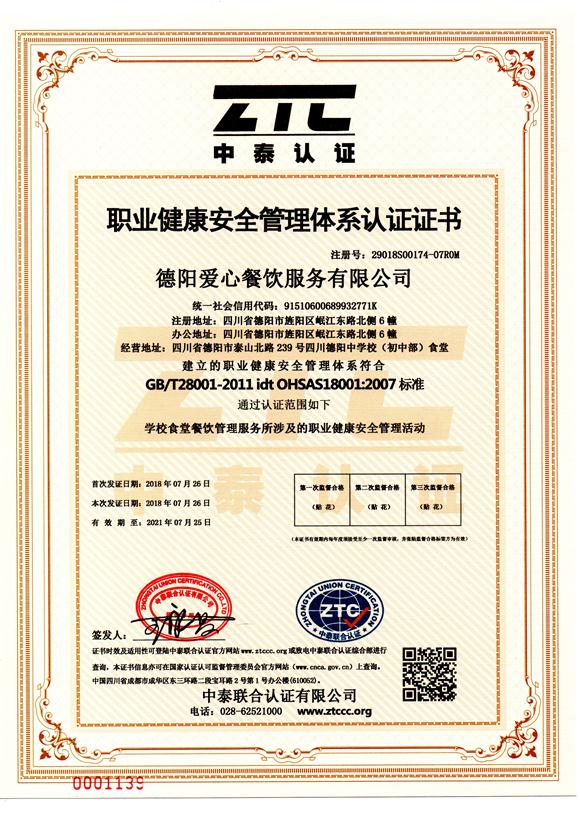 職業(yè)健康安全管理體系認證證書
