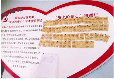 “墻上的愛心”慈善公益項目,是郭家橋社區(qū)黨委在街道黨工委支持下,攜手轄區(qū)愛心企業(yè)成都三藏素食餐飲管理有限公司和社區(qū)長壽食坊開展的為社區(qū)困境空巢老人送餐活動。以餐飲店為載體,前來消費的市民自愿獻愛心,每留下一碗素食的錢,墻上的捐贈欄就會貼上一個愛心標簽;然后由企業(yè)用捐贈的錢制作愛心餐,交給社區(qū)黨員志愿者為困境空巢老人送餐。